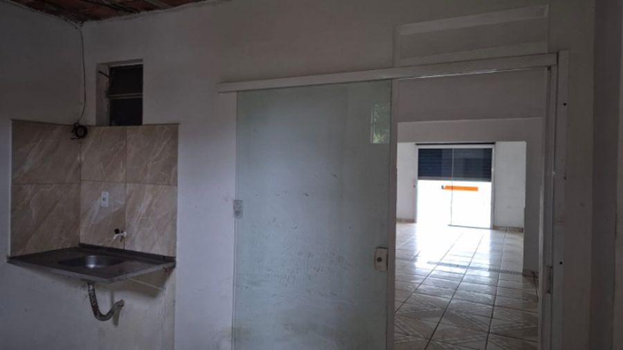 Fechamento com porta de ferro e segunda porta de vidro temperado, se instalar divisória terá 2 ambientes além da cozinha na parte dos fundos, ar condicionado, banheiro com ladrilhos.
